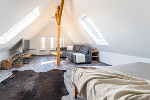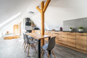 V podkrovním apartmánu se včetně přistýlek vyspí až 8 hostů. Kompletně vybavená kuchyňská linka umožňuje plnohodnotné samostatné stravování, případně je možné využít restaurace v blízkém okolí. Parkování u ubytování je bezplatné.